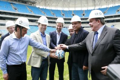 O sócio-presidente da 9ine e ex-jogador, Ronaldo Nazário, esteve nesta terça-feira, 13 de novembro, na Arena Porto-Alegrense. Além de conhecer os detalhes do empreendimento, que é a mais moderna arena multiúso da América Latina e a primeira do Brasil, o Fenômeno foi o primeiro jogador a experimentar o gramado. Ronaldo e o representante residente do PNUD no Brasil, Jorge Chediek, foram recebidos por Carlos Eduardo Paes Barreto, superintendente da OAS Investimentos, pelo presidente da Arena Porto-Alegrense, Eduardo Pinto, e pelo presidente da Grêmio Empreendimentos, Eduardo Antonini.