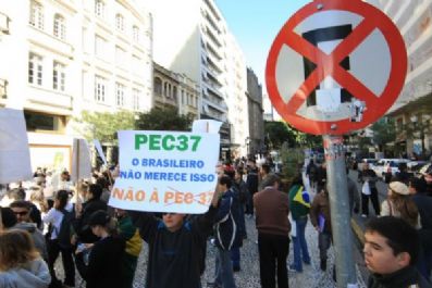 Manifestantes iniciaram um protesto contra a PEC 37 na praia de Copacabana, na zona sul, no início desta tarde. Centenas de manifestantes saíram do Posto 4 (próximo ao Copacabana Palace), em direção ao Forte de Copacabana, após fazerem um apitaço.