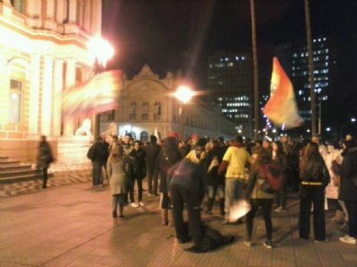 Apesar do frio intenso manifestantes se reuniram na frente do prédio da Prefeitura de Porto Alegre para protestar pelo passe livre universal na noite de hoje.