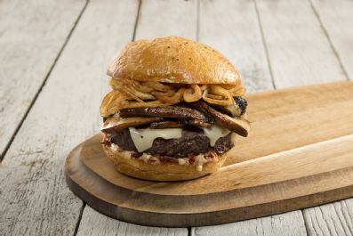 um hambúrguer de 200g coberto por cogumelos shiitake e crocantes tiras de