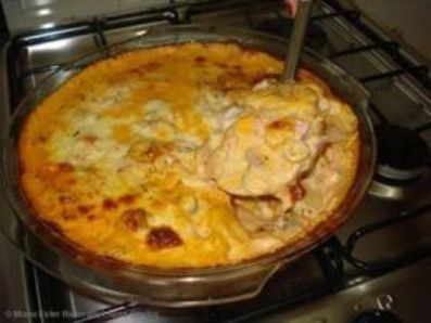 Numa travessa que vá ao forno, coloque umas colheradas dessa mistura de requeijão