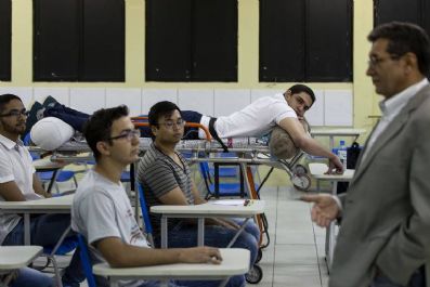 Uma situação inusitada tem acontecido na Universidade Federal do Piauí. Paraplégico depois de levar cinco tiros ao separar uma briga entre amigos, Leandro Silva de Sousa, de 21 anos, assiste às aulas na faculdade em uma maca. Estudante do segundo período do curso, o jovem foi alvejado no fígado, no pulmão, na barriga, na perna e na coluna há quatro anos. A última bala ainda está alojada na vértebra T11, o que tirou os movimentos e parte da sensibilidade da cintura para baixo.