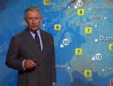 O Príncipe Charles, herdeiro do trono inglês, virou apresentador da previsão do tempo da BBC Escócia por um dia. Sally Magnusson, a atual apresentadora, ensinou o xará deste blogueiro. Tendo como pano de fundo o mapa do tempo, o príncipe leu um roteiro escrito especialmente para ele e que incluía referências a residências reais na Escócia.