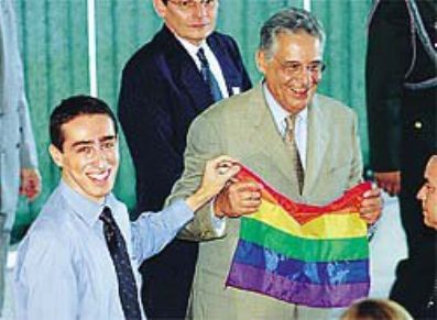 Vamos recordar? Já que o povo brasileiro tem a memória curta. Mas, antes que me chamem de "petista", mostro meu descontentamento com a administração atual, ok? A foto abaixo se chama HIPOCRISIA. No término do mandato de 8 anos, o propalado sociólogo Fernando Henrique Cardoso posou com a bandeira do arco-íris. Foram 8 anos de ostracismo quanto à causa GLBT: só lembrar que o projeto de Marta Suplicy vagava no Congresso, sob risos, escárnios e desprezo. FHC, certamente, deveria saber que cidadania é alicerce de democracia, dada sua formação. Não sou abalizado quanto ele no quesito acadêmico. Mas o critico como cidadão e digo o quão aviltante é o PSDB valer-se da social-democracia como parte de sua sigla.