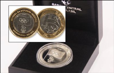 Outra moeda é de prata, com valor de face R$ 5, e tiragem máxima de 20 mil peças. No anverso a bandeira Olímpica ocupa o centro da composição, que se completa com a legenda Entrega da Bandeira Olímpica e a logomarca dos Jogos Rio 2016. No outro lado, destaque para a ilustração alusiva a dois ícones das cidades Olímpicas: a Tower Bridge, representando Londres, e o Cristo Redentor, representando a cidade do Rio de Janeiro. Na face da moeda, completam a composição o valor de face e a legenda Londres 2012-Rio 2016 e Brasil.