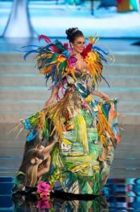 Em uma das preliminares do Miss Universo, nessa sexta-feira (14), Gabriela Markus desfilou de traje típico. O vestido da Miss Brasil homenageou a fauna e a flora brasilera.