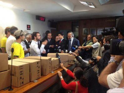 Mais um golpe contra a corrupção. Ativistas , entregam pizza de petição ao senado Federal. Nesta pizza o recheio era nada mais do que 1.6 milhões de assinaturas colhidas pelo Brasil. Esta pedindo a saída do presidente do Senado Renan Calheiros. Este já se encontra envolvido em vários crimes citados de contratação de parentes , junto ao senado e também e acusado de procurar beneficiar seu partido junto a vários medidas tramitadas no senado.