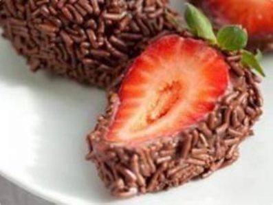 Com as mãos untadas, envolva os morangos com o brigadeiro e passe-os no granulado. Sirva em forminhas de papel.