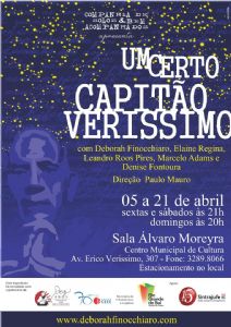“Um Certo Capitão Verissimo” é uma transcriação teatral do vasto universo do escritor Erico Verissimo. Lírico, cômico, dramático, musical e épico, o espetáculo traz uma composição de fragmentos de textos literários, depoimentos, poemas e discursos, personagens vindos do continente e do mundo dos mortos, que se misturam entre falas, diálogos, sombras, músicas e imagens em uma livre poética cênica. A peça é um convite a um mergulho na filosofia de Erico Verissimo. Um espetáculo que diverte, encanta, emociona e ao mesmo tempo provoca questionamentos sobre questões cruciais da nossa época.