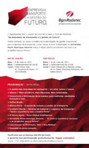 Com apresentação do jornalista Paulo Henrique Amorim que irá expor a sua visão econômica do cenário nacional, o objetivo do evento para aproximadamente mil pessoas, será reunir executivos de empresas de cargas e passageiros, como Grupo JCA (1001, Cometa, Catarinense), Grupo Comporte, Real, Joffer, Transmagno e Fadel, entre outras. “Houve um aumento na demanda por soluções tecnológicas e soluções de negócio, por isso, entendemos a necessidade de promover mais uma edição do evento que visa disseminar o conhecimento no mercado”, afirma Lauro Freire, diretor da BgmRodotec, salientando ainda que haverá uma palestra sobre consultoria de processos que passou a ser um serviço muito requisitado, pois garante o alinhamento entre os processos da empresa e o software de gestão Globus, proporcionando ganhos em qualidade, produtividade e consequente lucro.