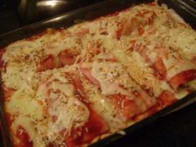 Modo de Preparo Cozinhe o macarrão por 5 minutos em água e sal Escorra Coloque sobre uma tábua de carne 1 fatia de presunto, por cima 1 fatia de queijo mussarela Com um garfo pegue uma pequena porção de macarrão e coloque por cima do queijo, por cima do macarrão uma porção de catupiry Finalize com 1 pitada de orégano Enrole como canelone Coloque-os lado a lado em uma forma refratária Cubra com molho de tomate e salpique o queijo ralado por cima Leve ao forno por 20 minutos Sirva quente