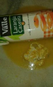— Hoje de manhã a nossa secretária cortou o dedo e não quis fazer suco de laranja. Aí tive a ideia de abrir a caixa que a minha mãe comprou. Vi que o lacre estava violado, senti um cheiro ruim e percebi que tinha algo estranho dentro. Quando derramei o líquido, caiu alguma coisa em decomposição junto.