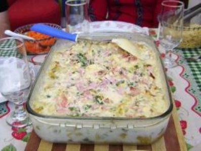 Ingredientes 500 g capeletti de frango 1 pacote de sopa de aspargos 800 ml de leite 500 g de nata (creme de leite fresco) 400 g de presunto picado 1 xícara de cheiro verde picado Sal a gosto Queijo parmesão ralado a gosto Modo de preparo Cozinhe o capeletti em água abundante e sal à gosto (al dente) Coloque o capeletti em um refratário untado e reserve Dissolva a sopa de aspargos no leite frio e acrescente a nata, o presunto picado e o cheiro verde Coloque esta mistura sobre o capeletti e polvilhe com queijo parmesão ralado Leve ao forno para gratinar por 30 minutos em forno médio