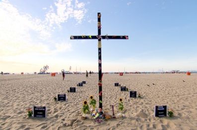Uma cruz de três metros, feita com os brinquedos de Larissa de Carvalho, de 4 anos, foi fincada nas areias da praia. A menina morreu após ser atingida por uma bala perdida em Bangu, na zona oeste do Rio, no último sábado (17). Ela atravessava a rua com a família quando foi baleada na cabeça.