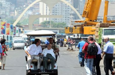Sob temperatura na marca dos 40 graus Celsius, o arquiteto Oscar Niemeyer visitou nesta quarta-feira (8), no Rio de Janeiro, as obras do Sambódromo. O projeto foi idealizado por ele há quase três décadas e previa o equilíbrio entre os dois lados da Sapucaí, com o efeito semelhante ao de um espelho.