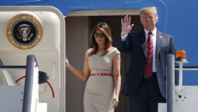 O Air Force One pousou no aeroporto de Stansted, ao norte de Londres, depois de deixar Bruxelas. Ele foi recebido pelo secretário britânico de Comércio Exterior, Liam Fox.