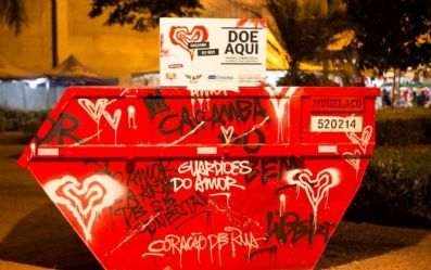 | Artista transforma caçambas de lixo em obras de arte para recolher roupas, brinquedos e alimentos, em Goiânia |