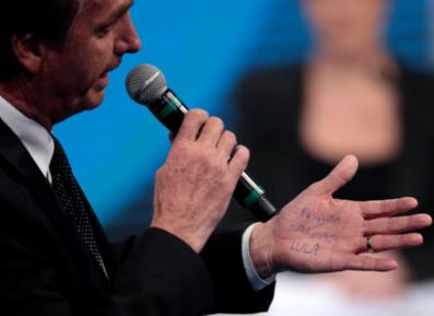 Durante o debate entre presidenciáveis promovido pela RedeTV, em São Paulo, na noite desta sexta-feira (17), o candidato Jair Bolsonaro (PSL) fez anotações na palma da mão esquerda que serviram de cola em sua participação, mas respondeu de forma ríspida sobre os lembretes. No momento em que foi flagrado, com as palavras “pesquisa”, “armas” e “Lula” escritas, perguntava à candidata da Rede, Marina Silva, sobre o porte de armas — o momento foi um dos mais tensos do programa.