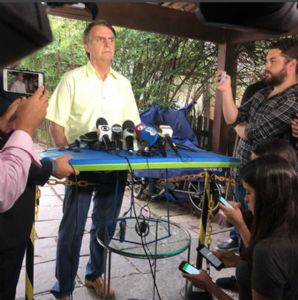 Um auxiliar de Bolsonaro precisou ficar segurando a tábua improvisada durante toda a entrevista para que os microfones não despencassem no chão.