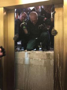As pessoas só conseguiram deixar o elevador depois de três horas, quando os bombeiros abriram um buraco na parede para resgatá-las.